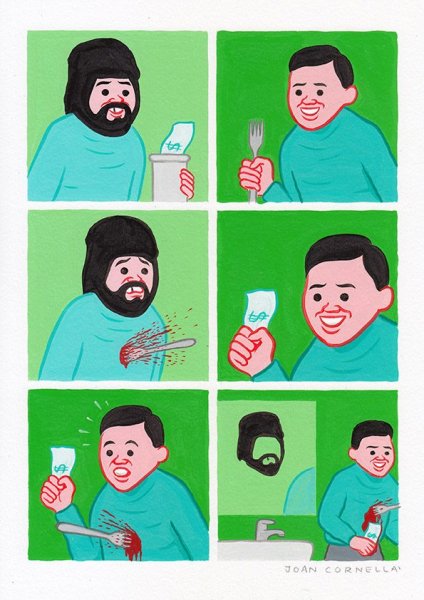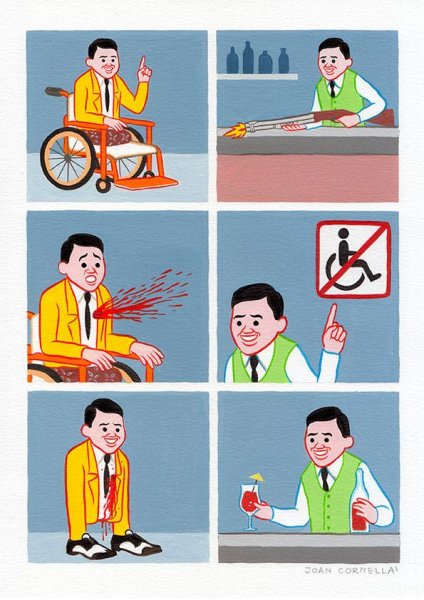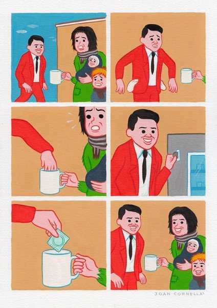 เราชอบงานของศิลปินคนนี้เพราะว่าความตลกร้าย จิกกัด และเข้าใจได้ง่ายโดยไม่ต้องมีคำอธิบายหรือแคปชันใดๆ ซึ่งเรื่องที่ Joan หยิบยกขึ้นมาวาดก็ครอบคลุมหลายประเด็นในสังคม ไม่ว่าจะเป็นศาสนา เหยียดสีผิว วัตถุนิยม เหยียดเพศ การเมือง ความรัก ฯลฯ อีกอย่างคือลายเส้นที่ไม่ซับซ้อน และคาแร็คเตอร์ผู้ชายหน้ายิ้มฟันขาวเจ้าประจำ ถ้าลองเลื่อนดูแฟนเพจเพลินๆ ก็อาจจะเผลอกดไลค์ไปหลายสิบรูปเลยแหละ