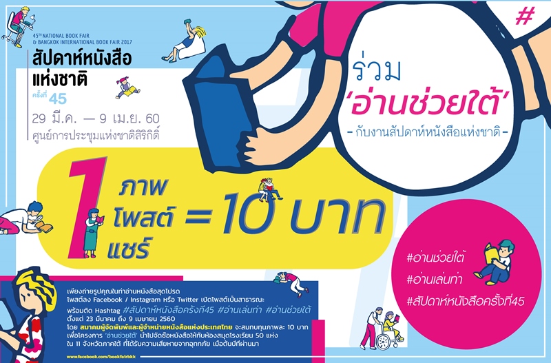 แต่ไฮไลท์อีกอย่างของงานนี้ที่เราอยากบอกต่อก็คือ โครงการรณรงค์ "อ่านช่วยใต้" ที่ขอให้หนอนหนังสือทั้งหลาย โพสต์ภาพถ่ายตัวเองตอนกำลังอ่านหนังสือลง Facebook หรือ Instagram และ Twitter พร้อมแฮชแทค #สัปดาห์หนังสือครั้งที่45 #อ่านเล่นท่า #อ่านช่วยใต้ (เลือกอันใดอันหนึ่ง หรือติดทั้งสามคำก็ได้) อย่าลืมเปิดโพสต์เป็นสาธารณะ (Public) ด้วยนะ