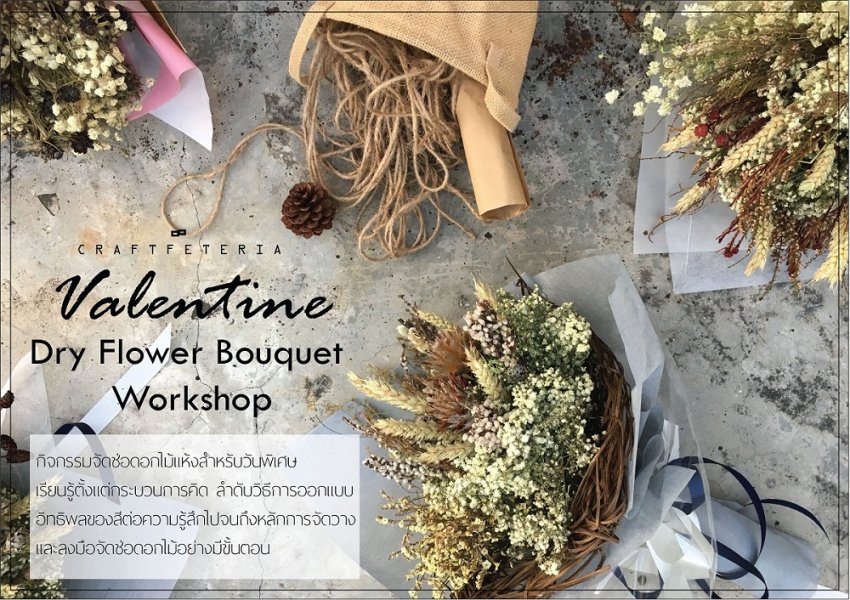เวิร์คช็อปที่จะพาไปรู้จักความงดงามของดอกไม้แห้งนานาชนิด พร้อมเรียนรู้กระบวนการออกแบบ อิทธิพลของสีที่ส่งผลต่อความรู้สึก การจัดช่อให้สวยงาม ที่จะเผยเทคนิคดีๆ เพื่อถ่ายทอดความเป็นตัวเองผ่านช่อดอกไม้สุดพิเศษ ใครอยากจัดดอกไม้ให้คนพิเศษในช่วงวาเลนไทน์นี้ หรืออยากเรียนรู้เผื่อโอกาสพิเศษอื่นๆ ก็ได้ทั้งนั้น ตบท้ายด้วยการทำ tag card ด้วยอักษร caligraphy