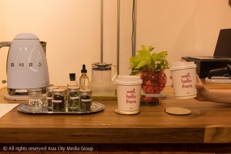 ความน่ารักเล็ก ๆ อย่างสุดท้ายของร้านนี้อยู่ตรงที่ Tea Bar ไซซ์กะทัดรัดที่เป็นของแบรนด์ Gloc เอง ซึ่งจะขายชาเบลนด์ทั้งหมด 5 ตัว คือ Oolong Milk Tea, Oriental Vibes, Coffee Black Tea, Roselle & Mulberry Green Tea และชาตัวสุดท้ายที่เป็น Surprise Menu ซึ่งจะเปลี่ยนไปเรื่อย ๆ อย่างวันนี้ที่เราไปก็จะเป็นชาเต้าหู้หมักที่น้องเค้ก-หุ้นส่วนร้านภูมิใจนำเสนอ (ราคา 95 บาท) ส่วนในอนาคตจะก็มีชาเย็นแบบเชค (120 บาท) ที่เลือกได้ระหว่างชาพีชและชาแอปเปิ้ลอีกด้วย
