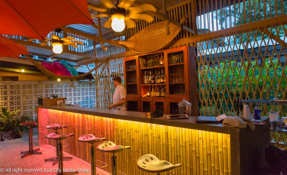 ความน่ารักของที่นี่ไม่ได้มีแต่แคร่ไม้ไผ่กับเปลญวนที่แขวนอยู่หน้าเคาน์เตอร์บาร์อย่างเดียว แต่ที่สนามหญ้าจะปูเสื่อไว้ให้นั่งเล่นยามแดดร่มลมตก พร้อมด้วยหมอนอิงแบบไทยๆ กับโต๊ะขันโตกสำหรับให้แก๊งค์เพื่อนมานั่งเมาท์มอยจิบค็อกเทลกันแบบชิลล์ๆ