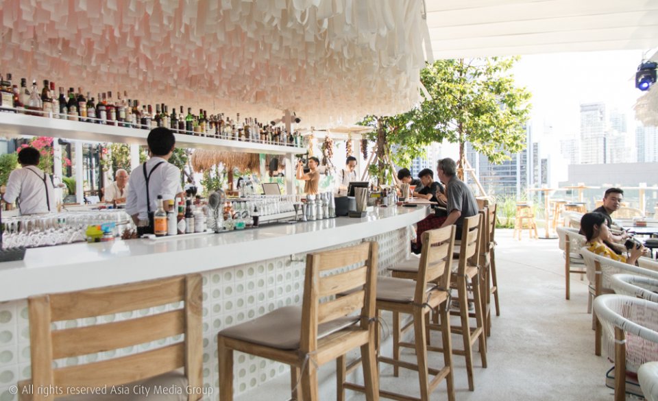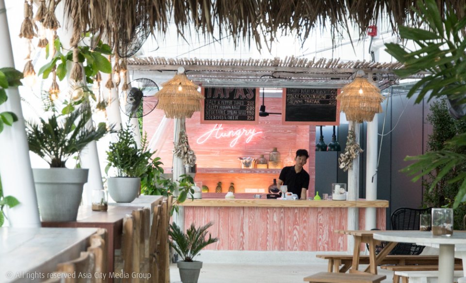ตั้งแต่ก้าวแรกที่ออกจากประตูลิฟต์มาองค์ลงบนรูฟท็อปชั้น 5 ความอะโลฮ่าลายพริ้นต์ฟลอรัล ไฟนีออนและฟลามิงโก้ต่าง ๆ ก็ต้อนรับเราพร้อมด้วยเมโลดี้อัพบีตส์แนวสวิงเซิร์ฟและบีชร็อกที่ดังออกมาจากบูธดีเจ แถมด้วยบาร์ค็อกเทลบิ๊กเบิ้มตรงกลางโซน เก้าอี้หวาย ซุ้มไม้ไผ่ และป้ายบอกทางสไตล์ทรอปิคัล จุด ๆ นี้คือแทบจะคิดว่าหลุดไปอยู่ในบีชคลับริมหาดไมอามี่จริง ๆ ซะแล้ว