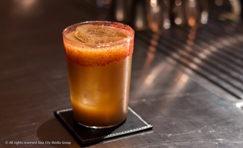 สุดท้ายคือ Bloodless Maria (390 บาท) ค็อกเทลสไตล์โมเดิร์นที่พี่หนึ่งตั้งใจฉีกทุกกฎของคลาสสิค Bloody Mary จนกลายมาเป็นแก้วนี้ในแบบฉบับของเหล้ามาร์ตินี่ เลือกใช้เบสเป็น Mezcal ผสม Tomato Vermouth