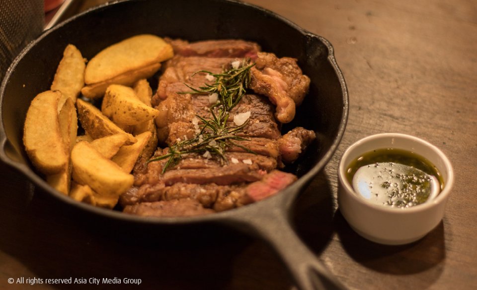 นอกจากเบอร์เกอร์แล้ว ที่นี่ไม่ขายอาหารอะไรอย่างอื่นอีกนอกจากสเต็กเท่านั้น ซึ่งความจริงจังของที่นี่ไปไกลถึงขั้นนำเนื้อไป Sous-vide ก่อนย่าง แล้วเสิร์ฟมาบนกระทะร้อน ซึ่งก็คือเจ้า Cast Iron นี่เอง ใครเป็นสายเนื้อก็มีทั้ง Rip-Eye (800 บาท) และ New York Strip (660 บาท) ให้เลือก ทีเด็ดคือ Chimichurri ซอสสไตล์อเมริกาใต้ที่เสิร์ฟมาคู่กัน ทำให้สเต็กจานนี้มีคาแรกเตอร์ชัดที่สุดในซอยอารีย์เลยก็ว่าได้ ปรบมือรัว!