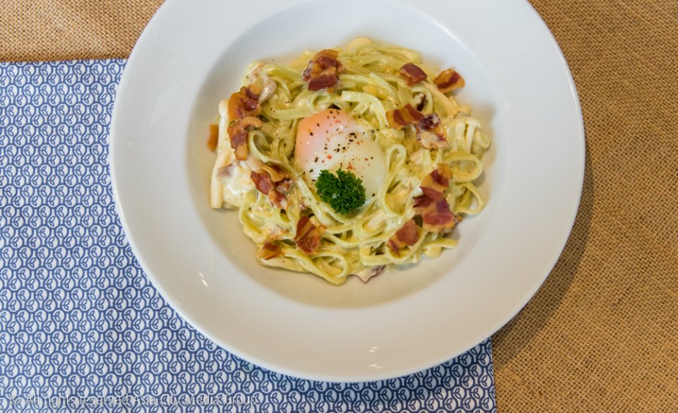 หิวขึ้นมาจริงจังแล้วใช่ไหมล่ะ? มาตะลุยจานหลักอย่างกับคาโบนาร่าไข่ออนเซ็น (245 บาท) เส้นพาสต้าโฮมเมดที่มีเมลอนเป็นส่วนผสม คลุกเคล้ากับชีส ท็อปด้วยเบคอนและไข่ออนเซ็น หรือจะเป็นแซลมอนย่างซีอิ๊วกระทะร้อน (295 บาท) ที่มีมันม่วงบดสีสวยเคียงข้างมาด้วย