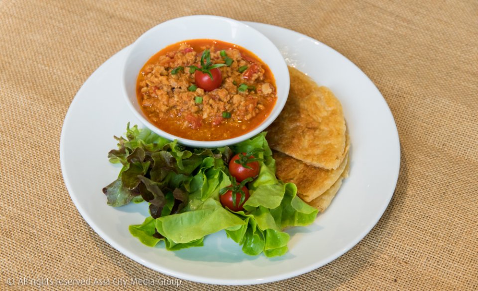 อีกอย่างที่เราชอบคือโรตีน้ำพริกอ่องมะเขือเทศเชอร์รี (175 บาท) รสชาติเข้มข้นได้อารมณ์เหมือนไปกินที่ภาคเหนือ แต่ถ้าใครอยากกินอะไรง่ายๆ ก็ยังมีข้าวกระเพราหน้าไก่คาราเกะและเห็ด (185 บาท) ไว้เป็นตัวเลือกนะ
