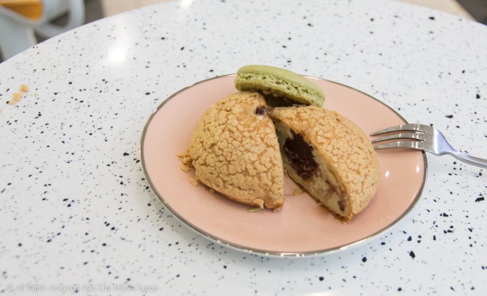 ไม่ใช่แค่เอแคลร์เท่านั้น แต่แป้งชูของร้านนี้ยังถูกเอาไปทำเป็น Choux Cream (95 บาท) ซึ่งเหมือนเป็นอีกซิกเนเจอร์อย่างหนึ่งของที่นี่นอกจากเอแคลร์ เราได้ลองตัว Matcha Red Bean Choux Cream ที่โปะด้านบนด้วยแป้งมาการอง ไส้ชูครีมด้านในเป็นครีมชาเขียวรสหวานน้อยและถั่วแดงบด ก่อนจะชิมตัวนี้เรากลัวว่าจะหวานจนเลี่ยน แต่กลับกลายเป็นทำรสชาติออกมาเหมาะกับคนสมัยใหม่ไม่ชอบของหวานอย่างเรามาก ๆ