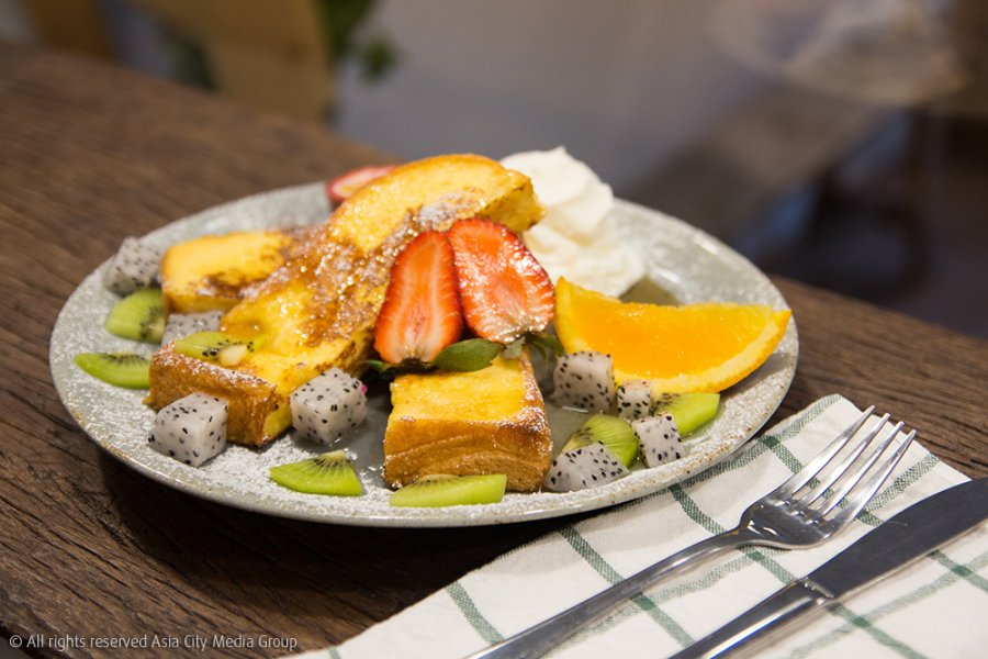 ถ้าอยากอิ่มขึ้นมาอีกหน่อยก็ลองสั่ง French Toast (190) มากินด้วยก็ไม่ผิด โทสต์ชุบไข่นุ่มๆ เสิร์ฟพร้อมบรรดาผลไม้หั่นพอดีคำอย่างแก้วมังกร กีวี่ เสาวรส สตรอว์เบอร์รี่ และส้ม ราดเมเปิ้ลไซรัปอีกนิดก็ฟินแล้วเธอ!
