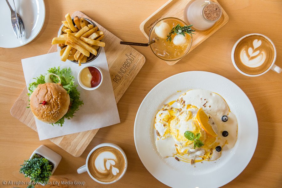 ลองสั่งชาลิ้นจี่ (130 บาท) ชา Twinings และเนื้อลิ้นจี่มานั่งดื่มเล่นๆ พร้อม Round About Burger (200 บาท) พออิ่มแบบพอดีๆ แถมมีให้เลือกทั้งเนื้อและหมู ส่วนเมนูที่เราถูกใจเป็นพิเศษก็คงจะหนีไม่พ้น Round About Pancake (180 บาท) แพนเค้กเนื้อนุ่มโปะไอศครีมวานิลลาราดด้วยซอสส้มให้รสเปรี้ยวเบาๆ ไม่เหมือนใครดีนะ สำหรับใครที่นังทำงานแล้วเกิดง่วงขึ้นมา ก็ยังมีกาแฟทั้งร้อนและเย็น (เริ่มต้น 65 บาท) ให้จิบอีกเช่นกัน