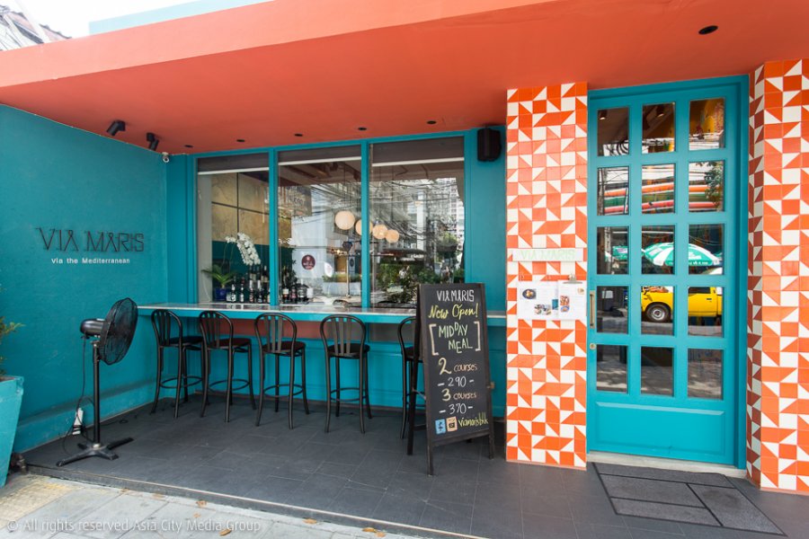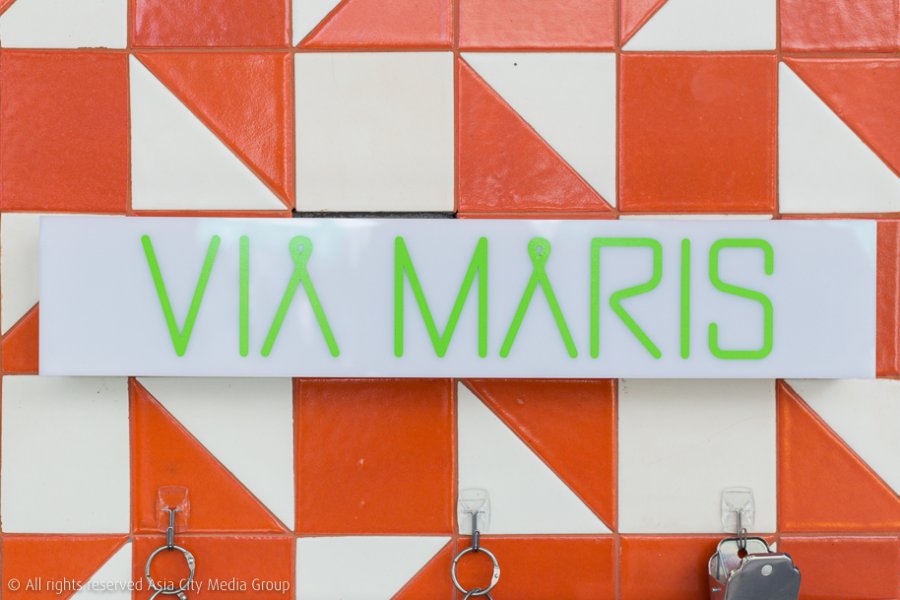 พูดกันตรง ๆ เลยว่า ถ้าสัญจรไปมาในซอยนี้แล้วไม่เห็น Via Maris คงจะต้องไปพบจักษุแพทย์ เพราะตัวร้านโดดเด่นเด้งดึ๋งดั๋งเกินหน้าเกินตาเพื่อน ๆ ในละแวกเดียวกันด้วยผนังสีเทอร์ควอยซ์ที่ชวนให้คิดถึงท้องทะเล ตัดกับกระเบื้องเซรามิกสีส้มที่ถูกจัดเรียงแบบเรขาคณิต เพิ่มความซีเรียสให้คาแรกเตอร์ขึ้นมานิดนึง แต่ก็ยังมีความขี้เล่นอยู่ไม่น้อย