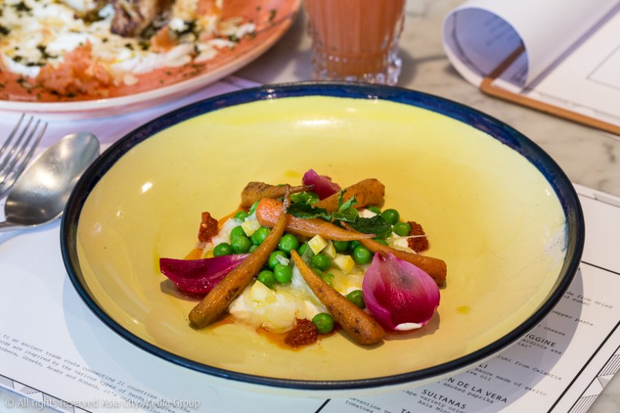 เราได้ลองมาทาน Set Lunch มื้อเที่ยง 3 คอร์สราคาย่อมเยาว์เพียง 370+ บาท (ที่นี่เขาไม่คิด service charge นะจะบอกให้ !) เริ่มจานแรกด้วยสลัดกรุบเบา ๆ เหมือนผู้หญิงรักสุขภาพมากินเองสวย ๆ Mediterranean Mess (ราคาจานเดียว 320 บาท) ที่ mess สมชื่อจริง ๆ เพราะในจานประกอบไปด้วยเบบี้แครอทอบกับผงยี่หร่า หัวหอมแดง ถั่ว ผักชีล้อม มี quark cheese ที่รสชาติและเท็กซ์เจอร์ใกล้เคียงกับโยเกิร์ตเป็นฐานที่มั่น พ่วงมาด้วยพริก harissa จากแอฟริกาที่เราขอเตือนว่าอย่าปรามาสความเผ็ดร้อนของมัน พริกเผาชิดซ้าย วาซาบิชิดขวา ไม่แปลกใจที่เชฟเจือดเสิร์ฟมาแค่ 3 พอร์ชันเล็ก ๆ จิ๋ว ๆ (กินคำเดียวก็ขอยอมแพ้แล้ว)