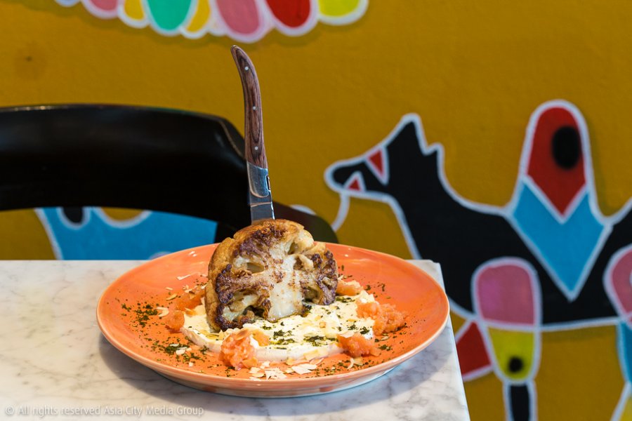 Chef Picks! เราขอให้เชฟเลือก 1 เมนูที่ชอบที่สุดจากทุกจานที่เสิร์ฟเราวันนี้ เชฟตอบอย่างไม่ลังเลเลยว่า ต้อง Cauliflower Steak (370 บาท) แน่นอนครับโผ๊ม ! (จินตนาการสำเนียงแบบอิตาเลียนเอาเอง) จานนี้ท้าทายความคิดสร้างสรรค์ของเชฟและทีมมาก ๆ เพราะต้องการให้ค่าพืชผักเป็นจานหลักเท่าเนื้อสัตว์ ผลลัพธ์จึงออกมาเป็น สเต็กกะหล่ำครึ่งลูก ที่ต้องเอากำหล่ำไปย่างนม ไปเข้าฟรีซให้คงรูป แล้วเอาออกมากริลล์อีกที เสิร์ฟบนกรีกโยเกิร์ต labneh รสชาติเปรี้ยวตัดกับความหวานของกะหล่ำ โรยด้วย za’atar เครื่องเทศจากตะวันออกกลาง เคียงกับมะเขือเทศอบกับผงยี่หร่า พอกินแล้วก็ตาสว่างเหมือนบรรลุธรรม เอ้อ ! ผักมันเป็นสเต็กได้จริง ๆ