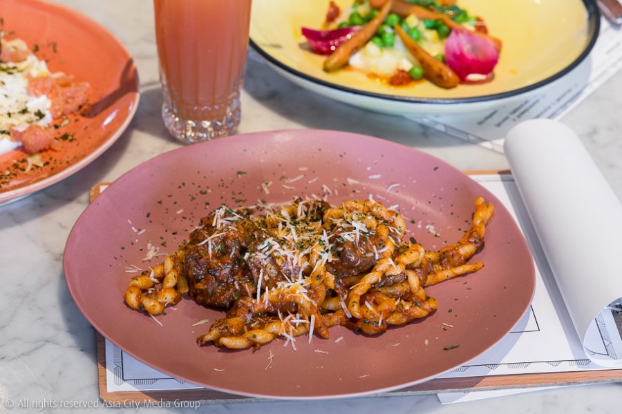 จานหลักในมื้อเที่ยงของเราคือ Pork Ribs Fileja (ราคาจานเดียว 360 บาท) ถึงตรงนี้คงเข้าใจตรงกันว่าเราสลัดคราบสาวสุขภาพไปหมดสิ้น และจัดการกินพาสต้าตรงหน้าแบบโนสนโนแคร์ความอ้วน พาสต้า fileja เส้นสดนิ่ม ๆ ที่เชฟเล่าให้เราฟังว่า ตอนปั้นก็ไม่ลำบากเท่าไหร่หรอกคู๊ณ แต่ตอนขดกับไม้ให้มันเป็นเกลียวนี่สิงานยาก เนื้อหมูก็ต้องตุ๋นจนนิ่มแบบใช้หลังช้อน-ส้อมบด ๆ แล้วจิ้มเข้าปากได้เลย แล้วไปคลุกเคล้ากับซอสหมูสไตล์อิตาเลียน spicy salumi กับชีสหนักเค็ม pecorino romano จนเข้ากัน ได้ฟังเชฟพูดขนาดนี้แล้ว มีหรือที่เราจะกินเหลือ เอร็ดอร่อยสมความยากลำบากของเขาเลย