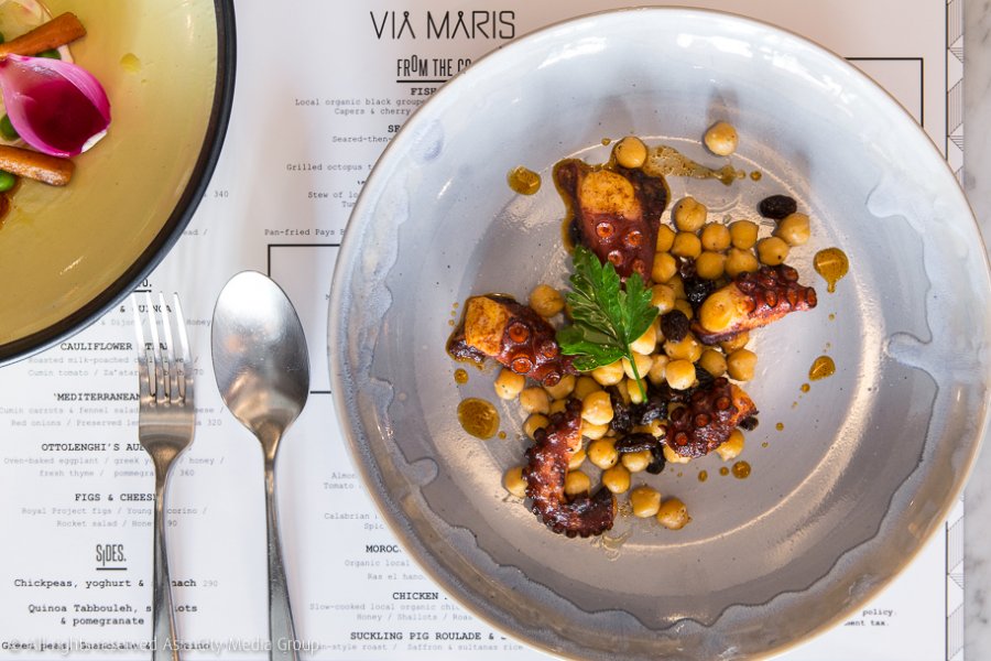 คำว่า Via Maris มาจากภาษาละติน มีความหมายว่า เส้นทางแห่งท้องทะเล (way of the sea) จึงไม่ใช่เรื่องแปลกเลยที่ก้าวเข้ามาในร้านแล้วจะเห็นภาพเพ้นท์มือรูปแผนที่ขนาดใหญ่ ที่เปิดเผยแหล่งที่มาของเครื่องเทศ วัตถุดิบ และของดีประจำประเทศต่าง ๆ ในแถบทะเลเมดิเตอร์เรเนียน อาทิ สเปน กรีซ โมร็อกโก แอลจีเรีย และที่สำคัญที่สุดเลยคือ อิตาลี บ้านเกิดของเชฟใหญ่ Francesco Deiana ผู้ลืมตาดูโลกบนเกาะซาร์ดิเนีย (Sardinia) แคว้นปกครองตนเองของอิตาลีที่ตั้งอยู่ใจกลางทะเลเมดิเตอร์เรเนียนแบบเป๊ะ ๆ (ลองไปเปิดแผนที่ดูได้) เท่ากับว่าเราจะได้กินอาหารเมดิเตอร์เรเนียนจากรสมือชาวเมดิเตอร์เรเนียนที่แท้ทรู !