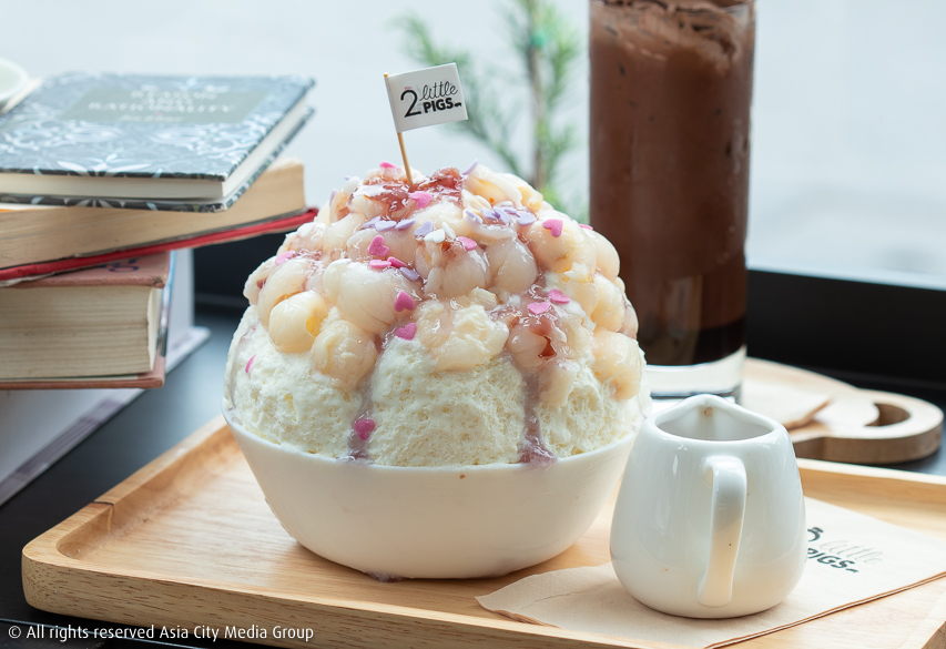 ด้านหลังของอัญชันคาเฟ่ยังมีฟิตเนสเปิดไว้ตอบโจทย์ทุกไลฟ์สไตล์ของคนย่านนั้น รวมไปถึง 2 Little Pigs คาเฟ่เล็ก ๆ ที่ซ่อนอยู่ด้านหลังตึกใหญ่ที่มีของหวานเด็ดดวงพวงมาลัยที่ควรค่าแก่การสั่งมาปิดท้ายมื้อเที่ยงของเรามาก ๆ อย่าง Anchan Lychee Kakikori (185 บาท) ที่กินแล้วละลายในปากไปเลย เราชอบมาก ๆ ตรงที่คากิโคริของร้านนี้ใช้นมสดล้วน ๆ เลยมีกลิ่นหอมและรสชาติที่ไม่หวานขึ้นเบ้าตาเหมือนที่อื่ม
