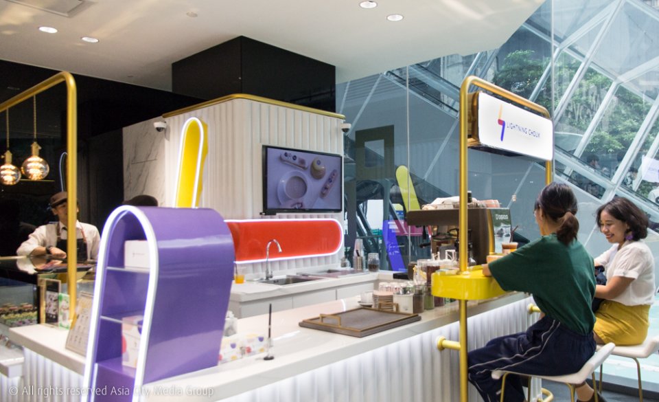 คาเฟ่สีชมพูหวาน ๆ ในสไตล์ฮาวายที่มีกิมมิกเป็นแพทเทิร์นลายดอก ใบจากมุงหลังคา และโลโก้รูปสาวน้อยฮูลาฮูล่าที่เห็นแล้วอยากระบำฮาวายเลยทีเดียว !