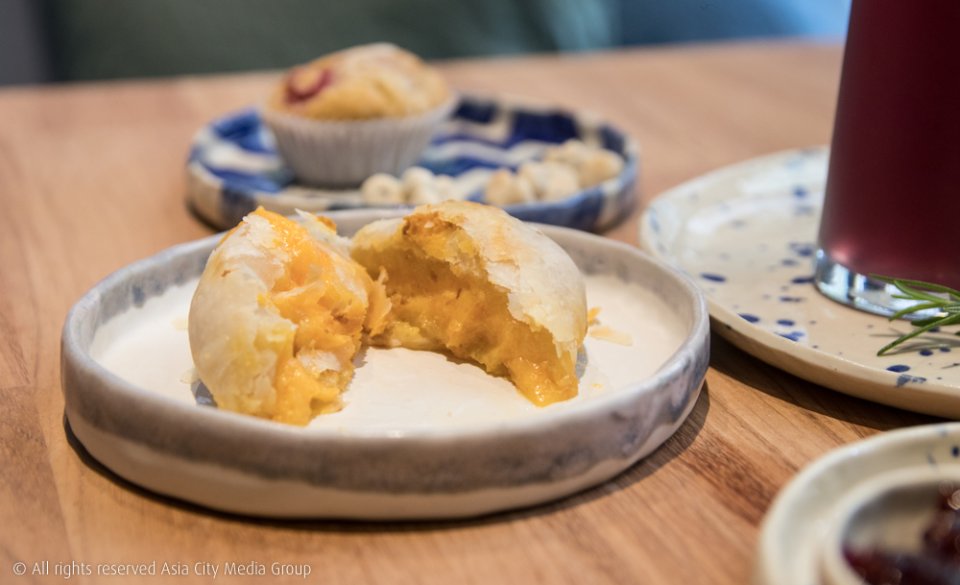 อีกเมนูที่เราชอบมาก ๆ ขอยกให้กับขนมเปี๊ยะไส้ลาวาไข่เค็ม (50 บาท) ที่พี่ปุ้ยอบเอง คือไส้คัสตาร์ดไข่เค็มเข้มข้นมากจนคิดว่ากินชิ้นเดียวอ้วนไปถึงปีหน้าแน่นอน (แต่ก็กินอยู่ดี) พร้อมเสิร์ฟมาในจานเซรามิคที่พี่แหวนปั้นเอง