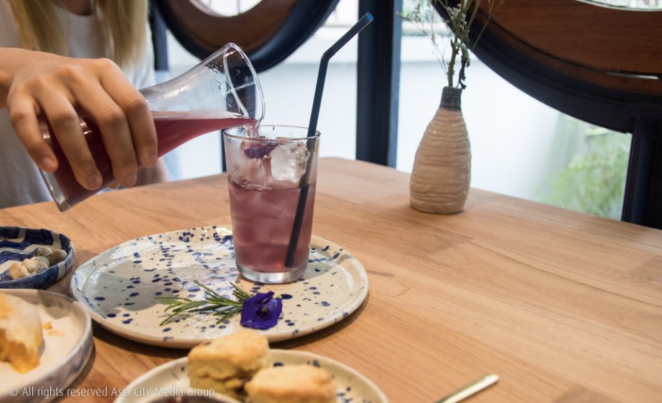 อีกแก้วที่เราชอบมากคือตัว Nitro Lime Rose Tea (80 บาท) ที่ใช้ชาสกัดเย็นจากใบชาอบกลิิ่นกุหลาบอย่างที่เราบอกไป มากดผ่านไนโตรแท็ป แล้วผสมกับน้ำมะนาวและไซรัปกุหลาบโฮมเมด กลายเป็นชามะนาวสีชมพูกลิ่นกุหลาบ เวลาดื่มต้องยกดื่มแบบไม่ใช้หลอด เพื่อให้กลิ่นของกุหลาบและใบชาอบอวลตีเข้าหน้าได้แบบเต็ม