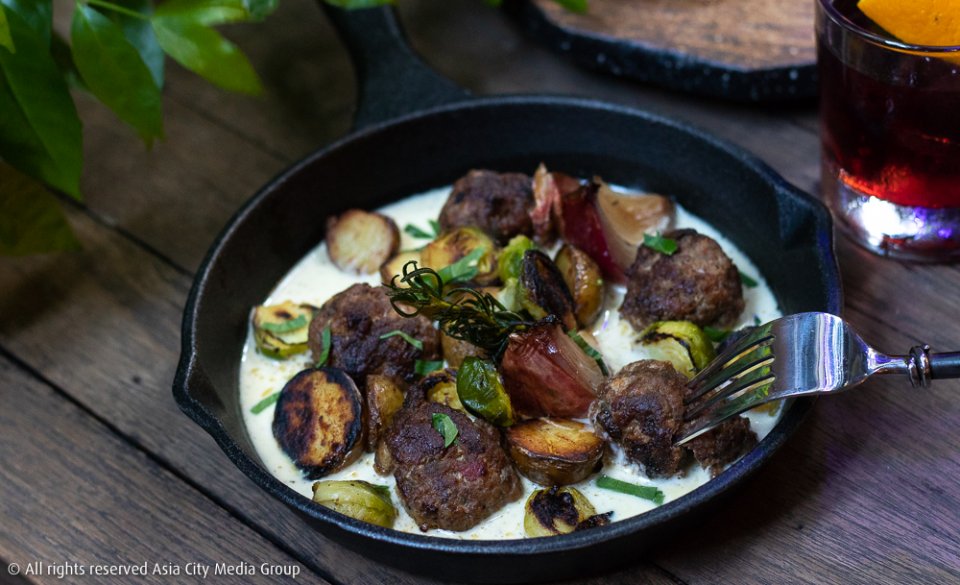 เราได้ลองชิม Wild Boar Meatballs (480 บาท) มีทบอลหมูป่าก้อนกลมปั้นมือที่นำไปทอดแล้วจึงกริลล์ต่อ ก่อนจะเสิร์ฟให้เรียงตัวนอนใน Sage Sauce ที่ครีมมี่สุด ๆ เสิร์ฟพร้อมกะหล่ำดาวหวาน และมันฝรั่งอบเนื้อนุ่มพอดี เมนูนี้ห้ามมัวแต่ถ่ายรูปลงไอจี รีบกินตอนร้อน ๆ จะได้รสชาติดีที่สุดนะ