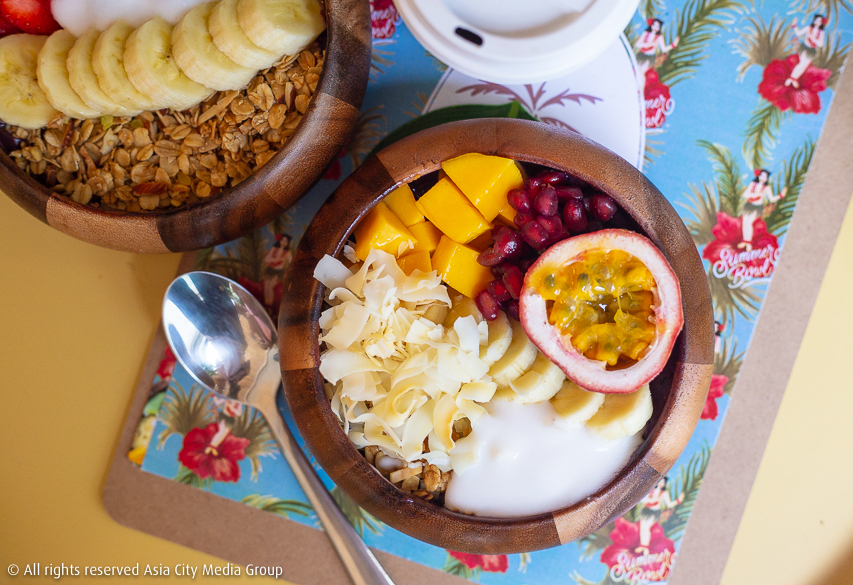Acai Bowl คือเมนูหลักของร้านนี้ ทำมาจากผลไม้ตระกูลเบอร์รี่ที่เป็นผลไม้ท้องถิ่นของชาวฮาวาย ถือเป็นซุปเปอร์ฟู๊ดที่ปริมาณแค่ 10 กรัม แต่มีสารแอนตี้ออกซิแดนท์ที่เทียบเท่ากับมะเขือเทศถึง 188 ลูก ! เราได้ลอง Waikiki Bowl (260 บาท) ที่เหมือนเป็นซิกเนเจอร์ของร้านนี้ มีเบสเป็น Acai ที่ผสมนมถั่วเหลือง หรือใครจะเลือกผสมน้ำมะพร้าวหรือนมอัลมอนด์ก็ได้เหมือนกันนะ ส่วนท็อปปิ้งที่มีให้ในเซ็ตอยู่แล้วก็มีทั้ง มะม่วง เสาวรส กล้วย และมะพร้าวอบ แต่เราขอเพิ่มทับทิมลงไปอีกเพิ่มสีสันและความกรุบกรอบ