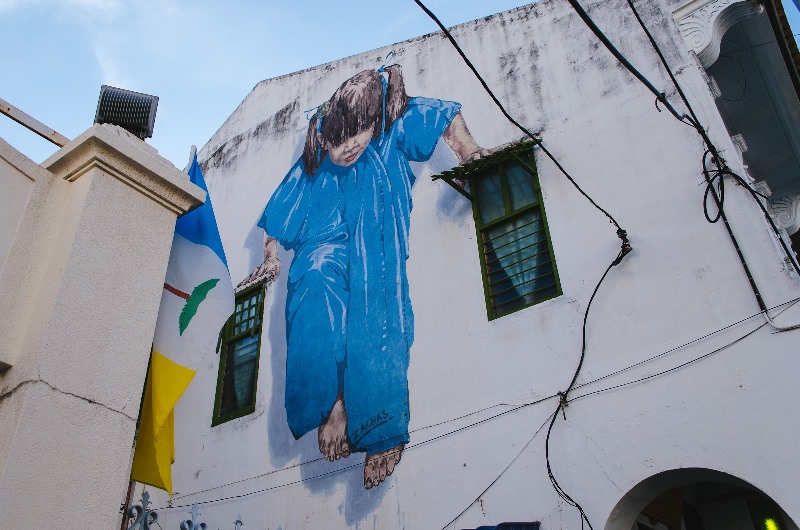 จากที่พักของเราบนถนน kimberley นั้นไม่ยากเลยกับการเดินตามหาภาพวาดฝาผนังสีสันสดใสที่เลื่องชื่อ อย่างเช่นภาพ boy on chair ที่ถนน cannon street หรือภาพ kungfu girl ที่ถนน jalan muntri อีกทั้งยังมีศิลปะเหล็กดัดเป็นการ์ตูนล้อเลียนตลกๆ อยู่ทั่วเมืองกว่า 20 ชิ้น เห็นมีเยอะๆ แบบนี้แต่ไม่ต้องกังวลว่าจะหาไม่เจอ เพราะการท่องเที่ยวปีนังได้ทำแผนที่รวบรวม street art สุดฮิตทั่วทุกจุดไว้ให้แล้ว โดยสามารถหยิบได้ฟรีตามที่พัก โรงแรม พิพิธภัณฑ์ หรือแกลอรี่ต่างๆ ได้รอบเกาะเลยล่ะ
