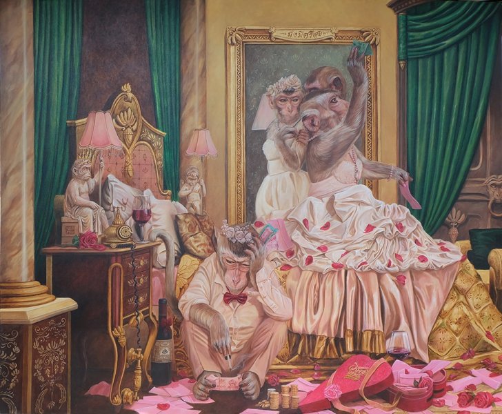 รัตนะ ขุนแก้ว กลับมาสานต่อเรื่องราวของ "ละครลิง" อีกครั้งหลังจากนิทรรศการครั้งแรกเมื่อ 2 ปีก่อน โดยคราวนี้นำเสนอฉากสำคัญของชีวิตจากบทละคร วิวาห์-วานร ผ่านผลงานจิตรกรรมสีอะครีลิคบนผ้าใบ สะท้อนแง่มุมของความรักที่สุดท้ายแล้วไม่ใช่เรื่องของคนสองคน เพราะพอจะแต่งงานกันก็มีปัจจัยต่าง ๆ มาวุ่นวายเต็มไปหมด