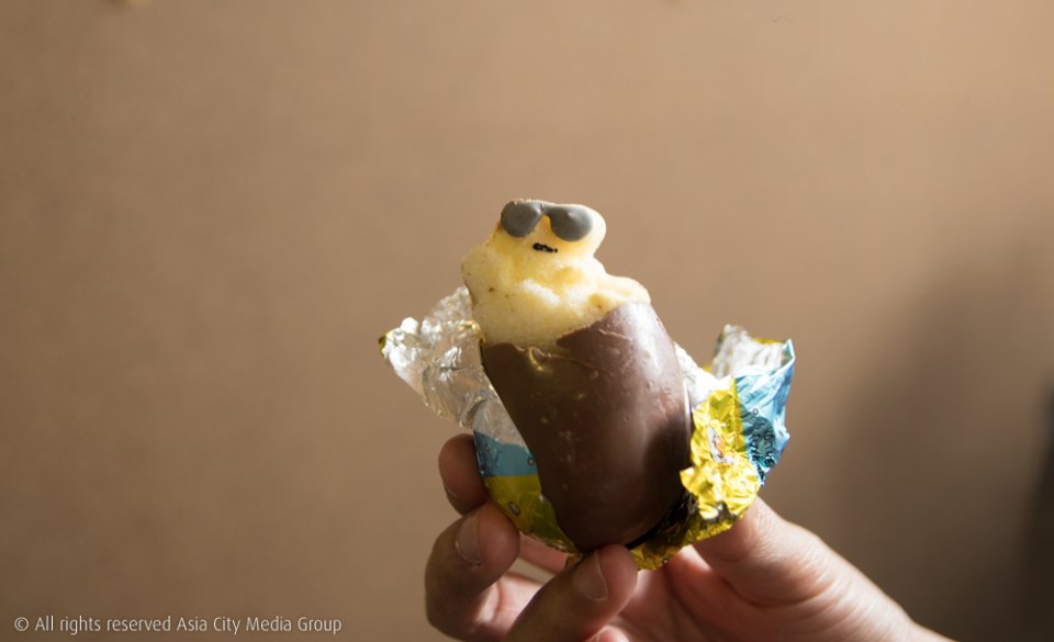 เจ้าไข่ขี้เกียจที่แอบซ่อนอยู่ในไข่ช็อกโกแลตอีกทีหนึ่ง ตัวช็อกโกแลตก็คือช็อกโกแลตอะ ไม่มีอะไรน่าตื่นเต้น แต่ตัวกุเดะทามะที่ซ่อนอยู่ข้างในนี่ทีแรกทำเอาสะพรึงด้วยหน้าตา และสะพรึงยิ่งกว่ากับรสชาติของมาชเมลโลวที่มีความเหนียวหนึบเยี่ยงเคี้ยวยาง ใครอยากรู้ว่าเป็นไงขอให้ลองดู