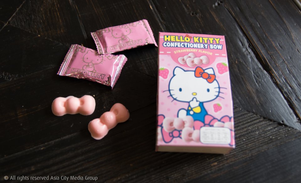 ขนมรูปโบว์สีชมพู ที่มาในแพ็คเกจสีชมพู พอแกะกินแล้วก็เป็นประมาณช็อกโกแลตรสสตรอว์เบอร์รี่ที่เราเคยกินในขนมเด็กเมื่อก่อนนั่นแหละ ก็ถือว่าขายความเป็นคิตตี้กันไป