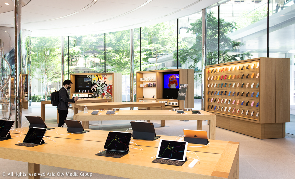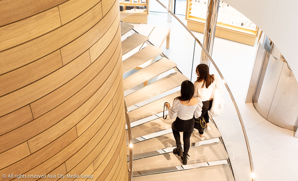 ที่ไม่พูดถึงไม่ได้คงจะเป็นเจ้าดีไซน์ที่เรียกว่า Tree Canopy ซึ่งเป็นการออกแบบร่วมกับทีมสถาปนิกจากฝั่งสวิตเซอร์แลนด์ มีจุดเด่นอยู่ที่แกนไม้ตรงใจกลาง ประกอบขึ้นจากไม้เนื้อแข็งสีอ่อนที่ต้องคราฟต์กันแผ่นต่อแผ่นเพื่อให้โค้งเว้าและเชื่อมจากตัวแกนขึ้นสู่เพดาน รวมถึงออกแบบบันไดเวียนรอบแกนไม้ขนาดยักษ์ เพื่อเป็นทางเดินระหว่างพื้นที่ชั้นบนสุดซึ่งเป็นส่วน The Forum สำหรับการจัดแสดงและจัดเวิร์กชอปหลากหลายรูปแบบ กับชั้นหนึ่ง ซึ่งเป็นพื้นที่วางขายผลิตภัณฑ์ทุกชนิดของ Apple โดยมีพนักงานกว่า 130 ชีวิต และพูดได้ถึง 17 ภาษา จะอยู่คอยให้บริการกับลูกค้าทุกคน (ที่จองมา)