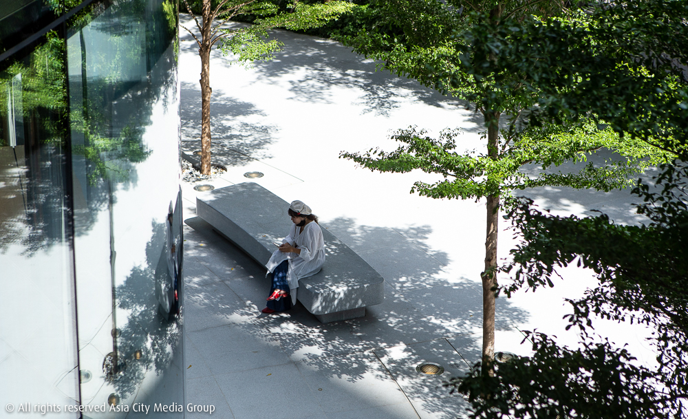 โครงสร้างอาคารทรงกระบอกของ Apple Central World มีจุดเด่นอยู่ที่กระจกใสขนาดยักษ์ที่ลายล้อมอยู่ทั้ง 360 องศา ซึ่งที่เราชอบมาก ๆ คือนอกจากวิวตึกสูงเพื่อนบ้าน ตัวห้าง และการสัญจรบนท้องถนนของสี่แยกราชประสงค์อันจอกแจกจอแจแล้ว สิ่งหนึ่งที่สร้างขึ้นมาตัดมู้ดความวุ่นวายนี้ได้อย่างอยู่หมัด คือบรรยากาศจากโซนเอาต์ดอร์ที่ลูกค้าอย่างเราสามารถมองเห็นได้จากภายในร้าน มีจุดไฮไลต์คือม้านั่งหินอ่อนและต้นหูกระจงขนาดใหญ่ (กิมมิกของ Apple Store ประเทศไทยเขาล่ะ) ซึ่งถูกจัดวางตัวให้โค้งรับไปกับตัวอาคารได้อย่างมีดีไซน์