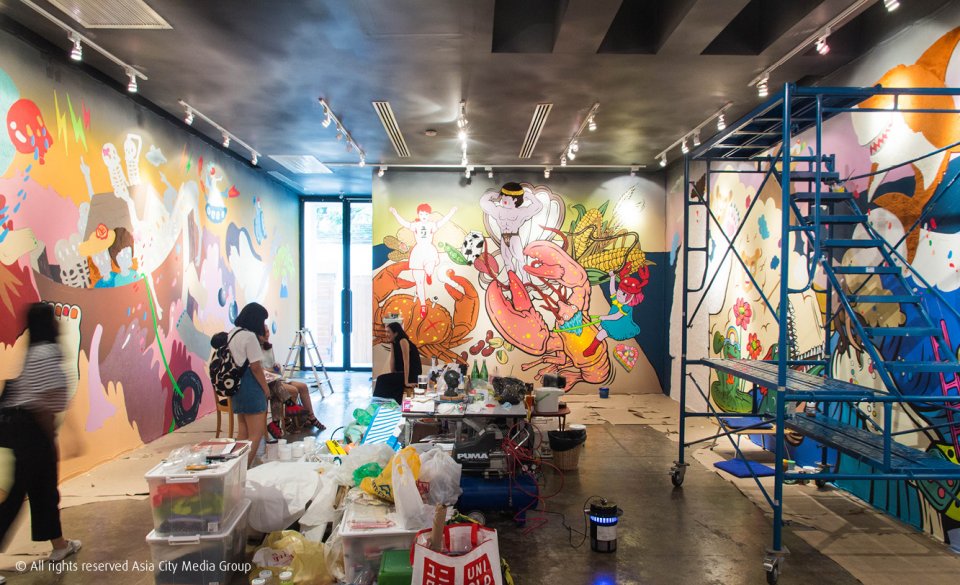 อย่างกำแพงด้านแรกที่เห็นเป็นกุ้งกับปูหน้าตาน่ารักน่าชัง ความจริงแล้วเป็นแผนภูมิภาพแสดงเมนูอาหารที่ยุรีกินไม่ได้ทั้งนั้น