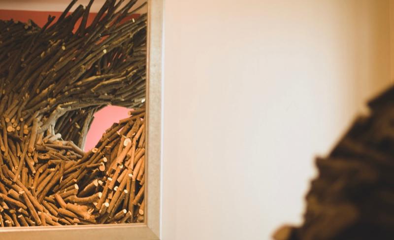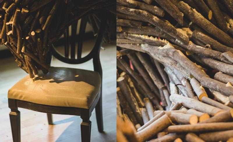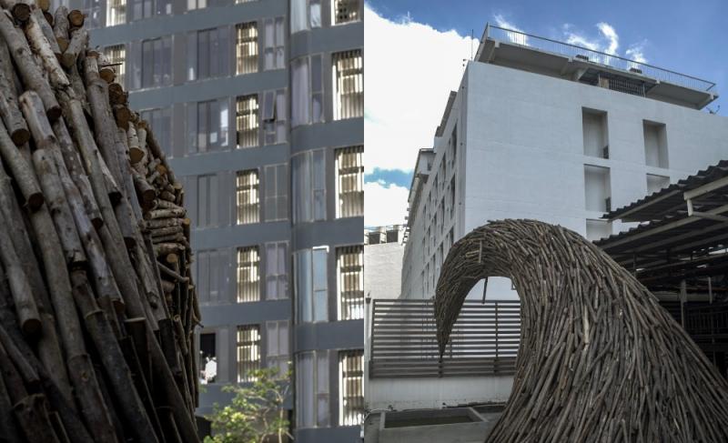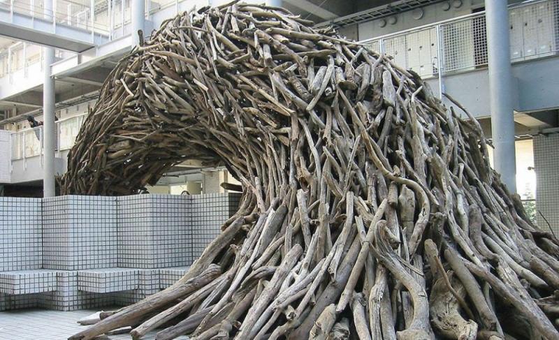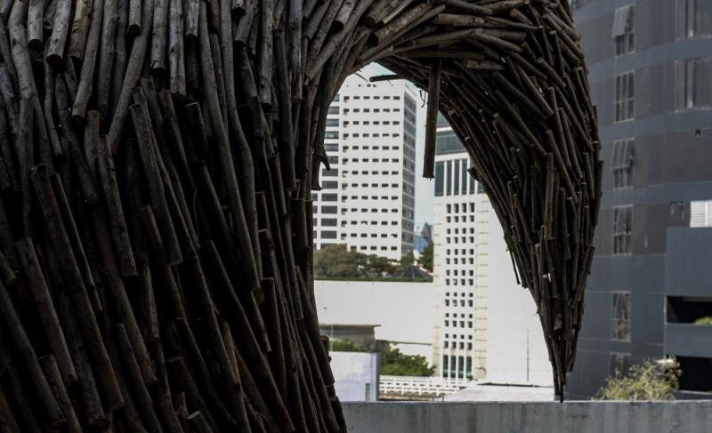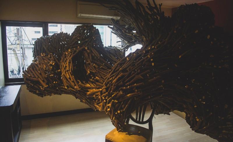 สิ่งที่ทำให้เราสนใจจนดั้นด้นตามไปดูผลงานของนาคามุระในครั้งนี้ก็คือ ภาพเศษไม้นับพันชิ้นที่ถูกนำมาประกอบร่างใหม่ให้เป็นศิลปะแนวจัดวางขนาดใหญ่ที่ดูขัดกับสิ่งก่อสร้างที่เป็น เราเลยหาข้อมูลของงานชิ้นนี้และพบว่า มันซ่อนตัวอยู่อย่างลับแลในโรงแรมโรสกรุงเทพ ในซอยหน้าวัดหัวลำโพง ในย่านสุรวงศ์นั่นเอง