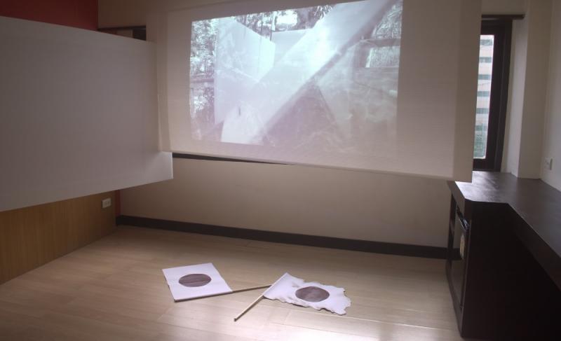 สำหรับงานชิ้นแรกที่เราได้ชมก็เป็นงานศิลปะจัดวางขนาดกลางที่จัดแสดงอยู่ในห้องโรงแรม โดยความหมายทั่วไปของงานศิลปะจัดวางก็คืองานศิลปะ 3 มิติ ที่ทำงานร่วมกับพื้นที่ (Space) ที่งานชิ้นนั้นตั้งอยู่ จนทำให้การรับรู้ของผู้ชมที่มีต่อพื้นที่นั้นเปลี่ยนแปลงไป หรือกล่าวง่าย ๆ ก็คืองานศิลปะที่ทำให้เกิดการตีความหมายพื้นที่ใหม่นั่นเอง