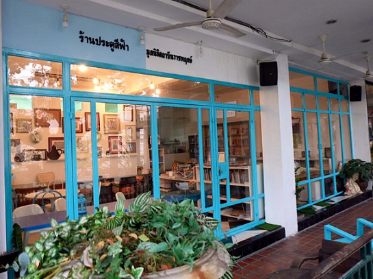 ร้านประตูสีฟ้าแห่งเวิ้งโบราณในซอยเอกมัยมี 2 บทบาทในร้านเดียว บทบาทแรกคือร้านหนังสือขนาดเล็ก อาจมีหนังสือให้เลือกไม่มากนักแต่ก็เป็นหนังสือที่คัดสรรมาแล้วอย่างดี มีทั้งวรรณกรรมและหนังสือทั่วไป รวมทั้งยังมีโปสการ์ดหลากหลายลวดลายให้เลือกซื้อด้วย ส่วนอีกบทบาทหนึ่งคือร้านอาหารที่เสิร์ฟเมนูอาหารจานเดียวทานง่าย เราว่าอร่อยทุกอย่าง แต่เมนูโปรดของเราคือข้าวปลาหมึกผัดไข่เค็ม (130 บาท) เครื่องดื่มมีทั้งชา กาแฟ และน้ำผลไม้ปั่นสูตรต่างๆ รสชาติดีงามตามมาตรฐาน ถ้าไปวันธรรมดาอาจต้องหลีกเลี่ยงช่วงเที่ยงเพราะร้านมักคลาคล่ำไปด้วยคนที่ทำงานอยู่แถวนี้รวมไปถึงนักท่องเที่ยวด้วย ถ้าสะดวกไปช่วงบ่ายจะดี ร้านจะโล่งหน่อย เลือกปักหลักที่โซฟาซักมุมแล้วนั่งอ่านหนังสือได้นานจนกว่าจะพอใจเลย