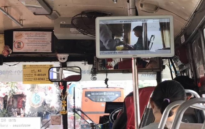 ถือว่าเหมาะมากสําหรับคนที่เข้าเมืองไม่บ่อย ที่จะได้รู้ว่าตอนนี้เรากําลังอยู่ที่ไหนเพราะบางทีไปถามกระเป๋ารถเมล์บางคน เขาก็ค้อนเราราวกับไปยื่นแบงค์พันให้ หรือจะหวังให้พี่ ๆ กระเป๋ารถเมล์บอกป้ายที่จะถึงทุกครั้งก็เกรงว่าคอจะแห้ง แล้วก็ตัวจอภาพเนี่ยเขานิยามกันว่าเป็นจออัจฉริยะเลยนะ เพราะมีการฝังจีพีเอสพร้อมกล้อง CCTV ไว้ในจอด้วย ลํ้าเลิศสุด ! แต่เอาจริง ๆ ตั้งแต่ใช้งานมาเรายังไม่มั่นใจว่า จอนี้มีไว้เพื่ออำนวยความสะดวกแก่ผู้โดยสาร หรือเอาไว้ลงโฆษณาของ ขสมก. กันแน่ เพราะตัวหนังสือที่บอกป้ายก็เล็กแบบอยู่ห่างจอสามก้าวก็มองไม่ออก แต่โฆษณานี่เต็มจอเชียว...