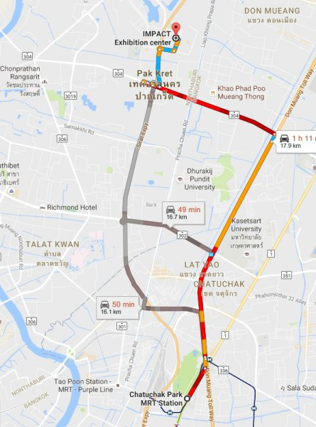 สถานีที่ใกล้ที่สุดคือหมอชิต และเราต้องรอรถเมล์ Express สาย A1 นั่งต่อไปอีกอย่างน้อย 30 นาที รถจะติดแค่ไหนก็ตามเวรตามกรรมจ้า