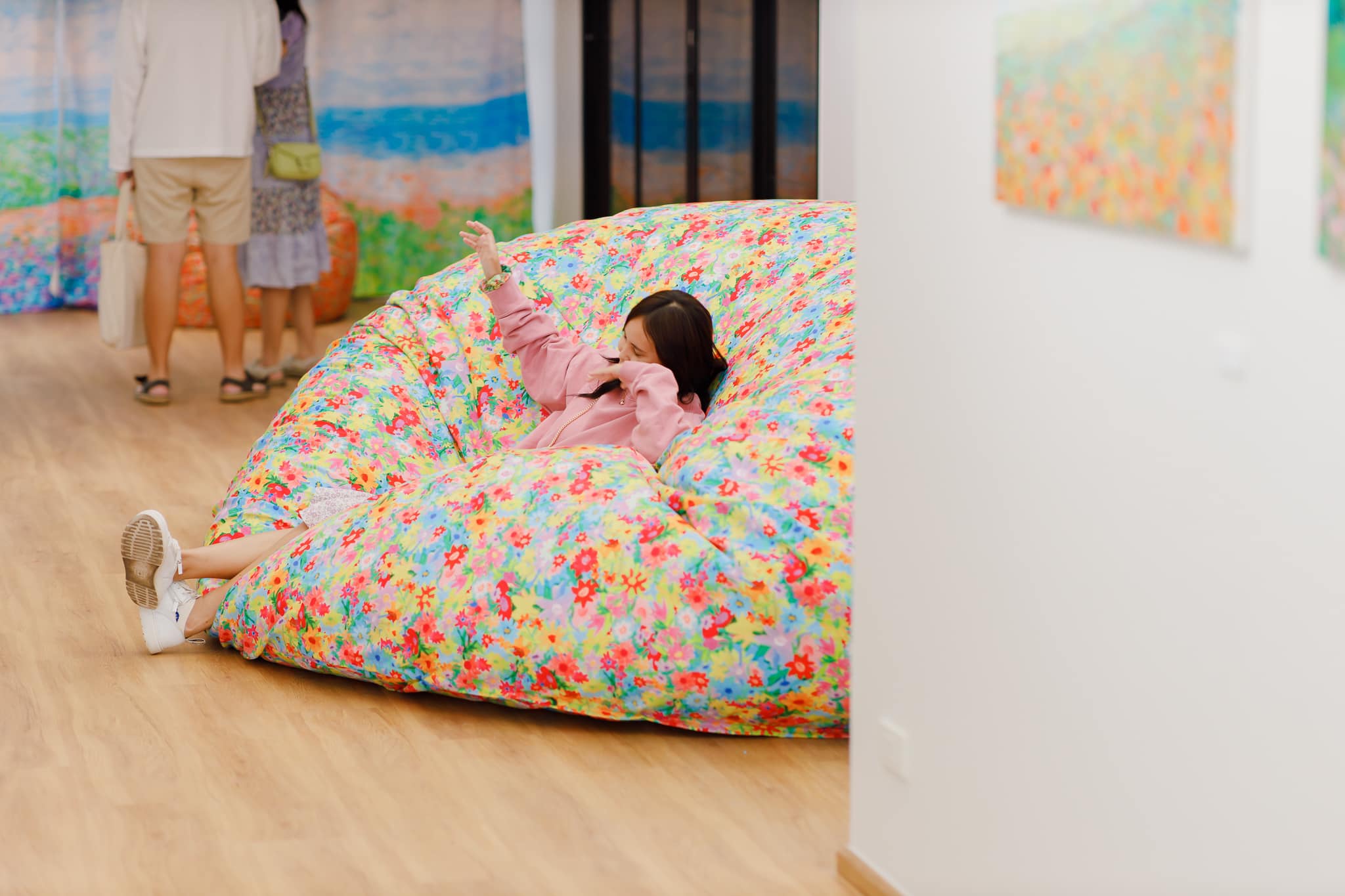 นอกจากงานเพนต์บนเฟรมผ้าใบแบบปกติแล้ว นิทรรศการทุ่งดอกไม้ BIG HUG ครั้งนี้ยังแถมเซอร์ไพรส์ให้คนดูด้วยการจับเอาทุ่งดอกไม้ของ give.me.museums ไปอยู่บนไอเทมต่าง ๆ ตั้งแต่ผนังแกลเลอรี ไปจนถึงบีนแบ๊กหุ้มผ้าลายดอกให้เราได้กระโดดทิ้งตัวลงไปบนทุ่งดอกไม้นุ่ม ๆ อีกด้วย