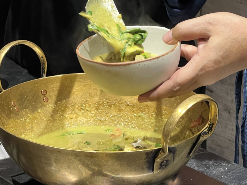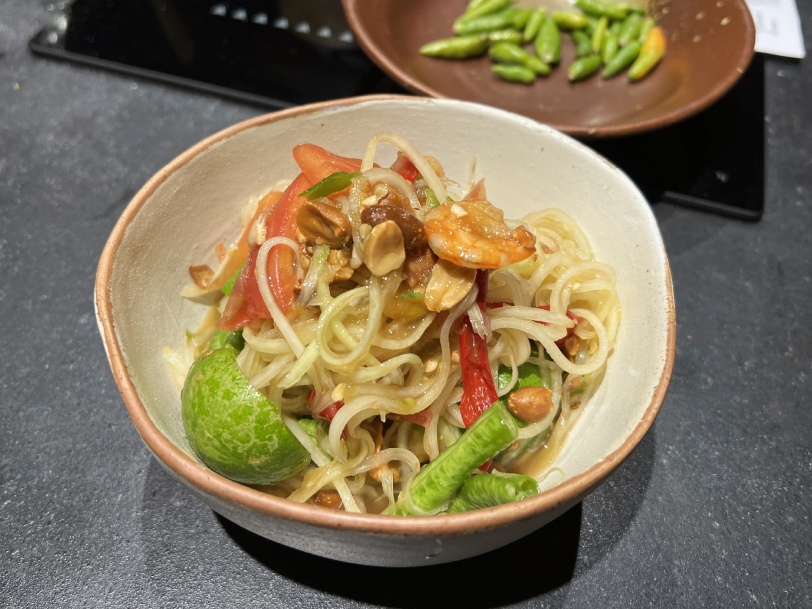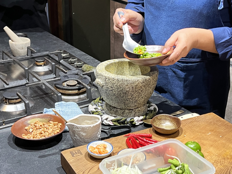 เชฟโบ ดวงพร ทรงวิศวะ เปรยขึ้น ระหว่างที่เธอเริ่มบรรยายถึงเมนูที่เราจะทำกันในคลาส โดยคลาสที่เราได้ลองฝึกมือก็คือวิชา ไทย ๑๐๔ ที่มีเมนูเป็น แกงเขียวหวานไก่ ปลาราดซอส 3 รส และส้มตำไทย ซึ่งวิชานี้ก็จะเวียนมาเรื่อย ๆ ในแต่ละสัปดาห์ แต่ละเดือน คละกับวิชาอื่น ๆ เช่น ไทย ๑๐๑ ผัดไทย ต้มยำกุ้ง ข้าวเหนียวมะม่วง ไทย ๑๐๓ ผัดกะเพราหมูสับ ต้มแซ่บไก่ ข้าวตู และที่น่าสนใจและเข้ากับช่วงนี้มาก ๆ คือ ไทย ๑๐๗ (เจ) ลาบเต้าหู้ ต้มข่าเห็ดย่าง ผัดมะเขือยาวเต้าเจี้ยว