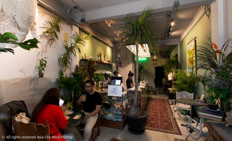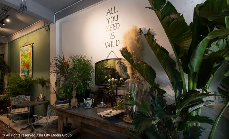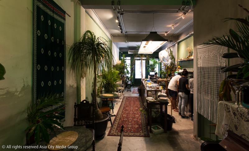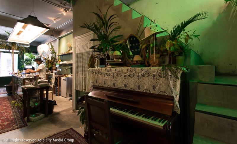 แต่เดี๋ยวก่อน ใช่จะมีแต่ถ้วยโถโอชามกันอย่างเดียว เพราะตั้งแต่เดินมาหน้าร้านสิ่งที่ต้องสะดุดเป็นอันดับต้น ๆ เลยนั่นคือ พืชพรรณต้นไม้ที่ใช้ตกแต่งร้าน สีโทนหลักของร้านจึงแบ่งเป็น 3 เฉดหลัก ๆ ได้แก่ สีเขียวจากไม้หลายชนิด สีน้ำตาลจากบรรดาเฟอร์นิเจอร์ไม้ต่าง ๆ โต๊ะ เก้าอี้ ตู้เก็บของ รวมถึงเปียโนไม้หนึ่งหลังข้างบันไดทางขึ้นชั้นสอง ส่วนสีขาวคือผนังที่บางด้านนั้นยังคงเป็นพื้นเดิมจากอาคารขายเฟอร์นิเจอร์เก่าหลังนี้ และไม่ใช่ช่างเก็บงานไม่เรียบร้อยแต่อย่างใด ผนังที่ดูไม่เรียบเป็นเนื้อสีเดียวกันนั้นก็เป็นความตั้งใจที่เจ้าของร้านอยากให้ออกมาเป็นความไม่สมบูรณ์ที่ออกมาเป็นความสวยงามเฉกเช่นนี้
