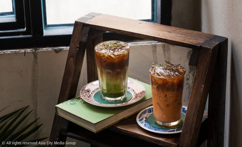 มาถึงทางด้านเมนูเครื่องดื่มก็มีเสิร์ฟทั้งคอคาเฟอีน สายหวาน จะชิลล์จิบชา หรือ น้ำอัดลมก็มีให้เลือกหลากหลายอยู่ ส่วนที่ทางร้านแนะนำมาให้เราได้ลองจิบกันเห็นจะเป็น เครื่องดื่มตระกูล หน่อบี่ (95 บาท) มีส่วนผสมของกาแฟและชาไทย อีกตัวชื่อว่า โบทานิก้าคอฟฟี่ (115 บาท) แก้วนี้จะใช้กาแฟผสมชาเขียวเข้มข้น ทั้งสองเมนูเสิร์ฟมาพร้อมจานรองกระเบื้องลดวลายสวยงามตามคอนเซปต์การแบ่งปันของสะสมมาให้ใช้กัน