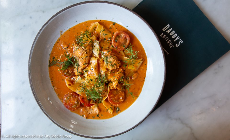 เมนูอาหารของ Daddy หลัก ๆ จะอิงไปทางฝั่งยุโรปซะเป็นส่วนใหญ่ แต่ก็มีปรากฏหน้าตาของเมนูแบบเอเชีย ๆ แซม ๆ มาบ้าง อาหารพร้อมเสิร์ฟของที่นี่มาในรูปแบบของ Comfort Food ทำง่าย ๆ อร่อยได้ง่าย ๆ เช่นกัน แต่ละเมนูนั้นก็มีรายละเอียดแตกต่างกันไป และความน่าสนใจหนึ่งอย่างอันเป็นความขึ้นชื่อที่ไม่พูดถึงไมได้เลยก็คือ เส้นพาสต้านั่นเอง ที่นี่ผ่านกระบวนการทำกันสดใหม่ตั้งแต่นำแป้งมาผสม-นวด-รีด จนได้ความนุ่มเหนียวหนึบของเส้นเหลืองนวลแบนนี้ อย่างเมนู Tagliatelle Pasta Salmon Pink Sauce (256 บาท) ก็ประกอบไปด้วยความเหนียวนุ่มของเส้นสด ๆ เคล้าไปด้วยแซลมอนรมควัน มี Saffron หมักไวน์ขาวกับมะเขือเทศเป็นเครื่องเคียง โรยหน้าด้วยผักชีลาว มีสีสันและหน้าตาดีไม่เบา