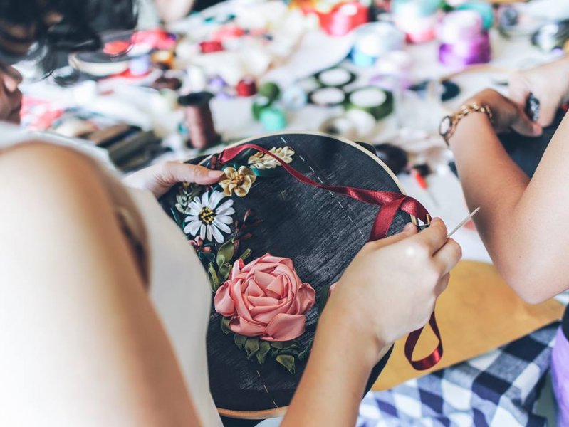 ขอแถมอีกหนึ่งเวิร์กช็อป เพราะถึงแม้จะไม่ใช่เครื่องหนัง แต่ภายในคลาสนี้เราจะได้ใช้ทักษะในการสร้างสรรค์กระเป๋าสไตล์วินเทจ โดยใช้เทคนิคการปักริบบิ้นเป็นพุ่มดอกไม้บนผ้าลินินสีดำ ได้ฝึกเทคนิคการขึ้นดอกต่างๆ ให้กระเป๋ามีมิติ และเลือกจัดวางองค์ประกอบเองได้ตามใจชอบเลย