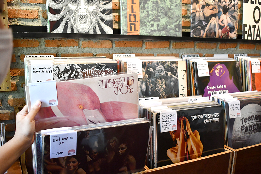 เมื่อเราได้ลองขุดคุ้ยกองแผ่นเสียงดูคร่าว ๆ พบว่าซีเลกชันของร้านนี้ค่อนข้างกว้าง ถึงกว้างมากที่สุด ไล่มาตั้งแต่แนวเพลง Indie Rock, Garage Psych, Brit Pop, 90s, Post Punk, Heavy Metal ไปยันแผ่นแปลก ๆ หาฟังยากอย่างแนว Noise Rock, Screamo, Post H.C. ไปจนถึง Sludge Metal ที่รับรองว่าถูกใจคอสาย Experimental ชัวร์ ๆ โดยหลัก ๆ แล้วเป็นของสะสมของตัวหุ้นส่วนทั้งสองคนที่ไม่อยากเก็บไว้ฟังคนเดียวอีกต่อไป เพราะฉะนั้นส่วนใหญ่เลยจะเป็นแผ่นเสียงมือสองที่สภาพกริ๊บเหมือนของใหม่มาก ๆ หรือที่ภาษาคนสะสมแผ่นเสียงจะเรียกว่า 'Near Mint' นั่นเอง