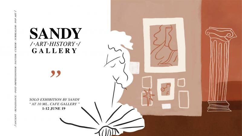 ถ้าเราไปแกลเลอรีอื่นเราอาจจะได้ดูงานนิทรรศการงานเดียว แต่ถ้าช่วงต้นเดือนนี้เราไปที่ 10ml. Cafe Gallery เราก็จะได้เดินชมถึง 3 นิทรรศการ และแม้ 10ml. จะเป็นแกลเลอรีไซซ์มินิย่านรัชดาภิเษก แต่ก็ขึ้นชื่อว่าเป็นแกลเลอรีที่มักจะมีงานศิลปะที่น่ารักและมีเนื้อหาน่าสนใจอยู่เสมอ สำหรับเดือนนี้ในชั้น 1 ก็จะมีงาน SANDY /•ART•HISTORY•/ GALLERY งานนิทรรศการเดี่ยวจากคุณครูแซนดี้ที่เปลี่ยนแกลเลอรีแห่งนี้ให้กลายเป็นห้องเรียนวิชาประวัติศาสตร์ศิลป์แสนสนุก เหมือนเดินย้อนเวลาเล่ากันตั้งแต่ศิลปะสมัยกรีกโบราณมาบรรจบถึงศิลปะยุคปัจจุบัน