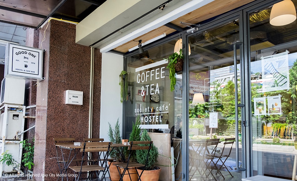 Good One Hostel & Cafe Bar คือโฮสเทลน้องใหม่แห่งย่านสาทรที่เพิ่งเปิดมาได้ไม่ถึง 3 เดือน เราแวะไปเยี่ยมกันตั้งแต่เช้าตรู่ในจุดที่เคยเป็นที่ตั้งของปัง เว้ย เฮ้ย!! บนถนนนราธิวาสราชนครินทร์ เมื่อเปิดประตูเข้าไปก็พบกับสเปซขนาดกระทัดรัดสไตล์อินดัสเทรียลลอฟท์เหมือนร้านกาแฟในกรุงเทพฯ ที่เราคุ้นเคย โดยมีการใช้โทนสีขาวเป็นหลัก และโครงเหล็กสีเทาแบ่งบาร์กาแฟและบาร์แอลกอฮอล์ออกเป็นสัดส่วน โต๊ะหินอ่อนสีขาวหลายตัววางเรียงรายกันอยู่ พร้อมเก้าอี้ไม้และม้านั่งยาวให้นั่งพักผ่อนหย่อนใจกันตามสบาย