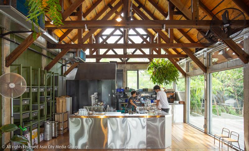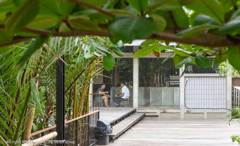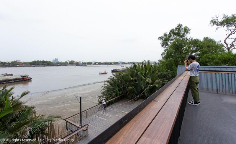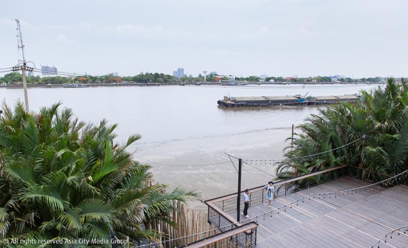 บรรยากาศของร้านนอกจากจะแวดล้อมไปด้วยธรรมชาติแล้ว ร้านซึ่งอยู่ติดกับแม่น้ำเจ้าพระยาเราจะได้นั่งชมทั้งเรือโดยสารตลอดจนเรือส่งสินค้า แล่นผ่านหน้าไปมา สัมผัสกับสายลมยามเย็นที่วิ่งมาทักทาย และอดไม่ได้ที่จะคว้ากล้องขึ้นมาถ่ายภาพในช่วงพระอาทิตย์อ่อนกำลังลง เราสามารถเดินขึ้นไปนั่งเล่น นั่งกิน บนโซนพื้นที่สูง 3 ชั้น มองวิวแบบ 360 องศา เห็นต้นไม้ที่สูงสุดบนเกาะอีกฝั่งและเห็นทัศนียภาพแบบเมืองอีกฝั่งตรงข้าม เป็นอะไรที่น่าจะช่วยให้พวกเราได้หยุดพักจากความวุ่นวายในช่วงเวลาปกติอยู่ไม่น้อย