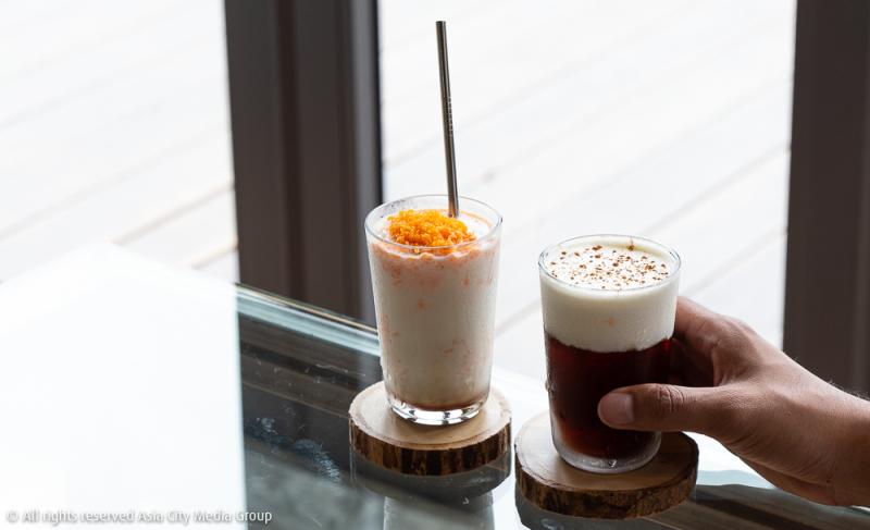 เมนูขวัญใจของนักท่องเที่ยวที่มาเยือนนั้นคงหนีไม่พ้นเครื่องดื่มประเภทเย็นเพิ่มความสดชื่นมีชีวิตชีวา ทางร้านแนะนำแก้วใหม่ล่าสุดให้เราได้ลอง คือ น้ำผึ้งโซดาผสมอัญชัน (110 บาท) มีเยลลีแถมมาให้เคี้ยว แก้วนี้อบอวลไปด้วยความหวานของน้ำผึ้งแท้ 100% และอัญชันสด ๆ คลุกเคล้าอยู่ในน้ำแข็งหอมหวานชื่นใจ เมนูที่มีความซ่า อีกแก้วอย่างครีมชีสหนา ๆ ที่ด้านล่างมีมอลต์ผสมโซดา (120 บาท) ก็เป็นอีกเมนูน่าลอง พลาดไม่ได้กับนมสดผสมน้ำตาลทรายแดงโรยหน้ามาด้วยไข่เค็ม (120 บาท) คนให้ทุกอย่างปนเปเข้ากัน เอ้าาาดื่ม!