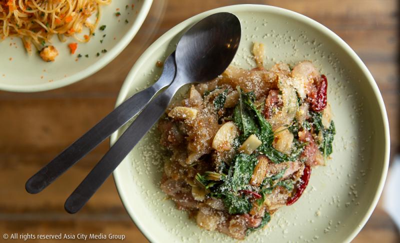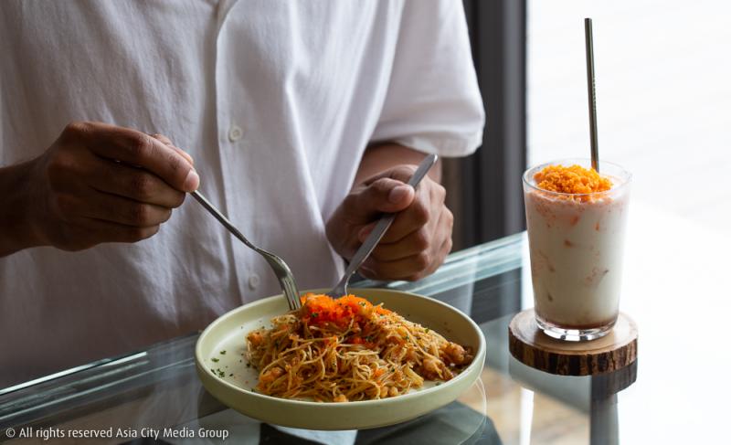นอกจากความสดชื่นที่นี่ยังมีอาหารสไตล์โฮมเมดให้ได้อิ่มท้องอีกต่างหาก เริ่มต้นด้วยอาหารจานซิกเนเจอร์ของร้านชื่อว่า อลันพาสต้า (195 บาท) สปาเก็ตตี้ที่เลือกใช้เส้นเล็กสุดในตระกูลพาสต้าเส้นกลมเคี้ยวง่าย เติมแต่งด้วยเนื้อกุ้งขนาดกลางหลาย ๆ ชิ้น เพิ่มความเคี้ยวมันด้วยไข่กุ้งอีกหยิบมือ บอกได้เพียงว่าจานนี้เครื่องแน่นดีงาม อีกจานในเมนูตระกูลเส้นก็คือ เส้นใหญ่ผัดเบคอนพริกแห้ง (145 บาท) ใครไม่ชอบกินเผ็ดก็สามารถชิมเมนูนี้ได้ แต่แอบบอกนิดหนึ่งว่าอย่ามัวแต่ถ่ายรูปเพลินจนนานเกินไป เพราะถ้าปล่อยทิ้งไว้นานเส้นใหญ่จะดูดซับความมันจนทำให้รสชาติอาหารอาจจะชืดได้ เพราะฉะนั้นมาเสิร์ฟปุ๊ปกินปั๊ปตอนร้อน ๆ เลยจะดีเยี่ยม