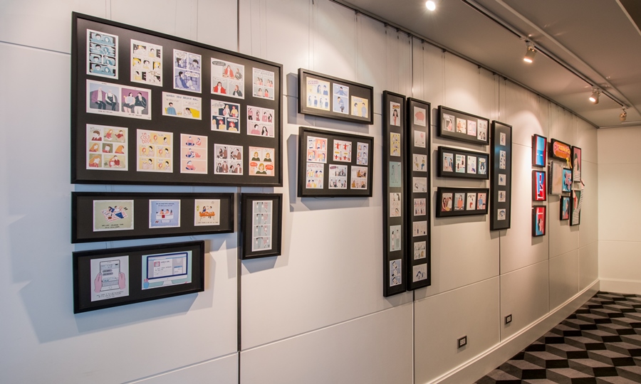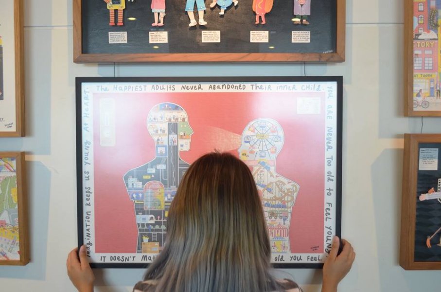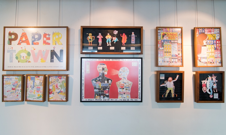 ผนังถัดมาได้รวบรวมเอาผลงานที่เคยลงในเพจ Sundae Kids มาไว้ด้วยกัน เห็นได้ชัดเลยว่าทั้งรูปวาดทั้งการเลือกใช้สีมันน่ารักละมุนไปหมด ขนาดเราเคยไลก์ในเพจไปแล้วนะ มายืนอ่านอีกทีเราก็ยังยิ้มได้อยู่ดี