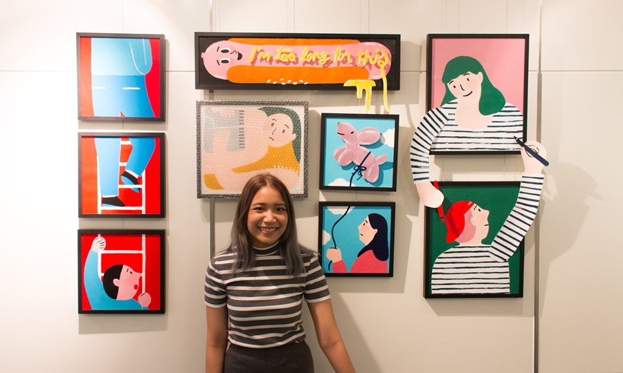 แต่สิ่งที่แตกต่างจากงานที่เราคุ้นเคยจะอยู่อีกด้าน สังเกตได้ว่าไม่เหมือนเซ็ตอื่นๆ เธอเล่าถึงความตั้งใจของโซนนี้ให้เราฟังว่า “ปกติแล้วคนก็จะไม่เคยเห็น Sundae Kids ในแบบ Painting กัน เราเลยอยากจะลองทำออกมา ว่ามันจะออกมาเป็นยังไง” ผลงานที่ออกมายังคงความเป็นคอมมิคด้วยการเล่นกับกรอบเหมือนเดิม แล้วก็ใส่ไอเดียที่สื่อถึงความเป็นเด็กไร้ขอบเขตความคิดเข้าไป อย่างที่เห็นว่าจะมีชิ้นส่วนของภาพออกมาอยู่นอกกรอบด้วยนั่นเอง